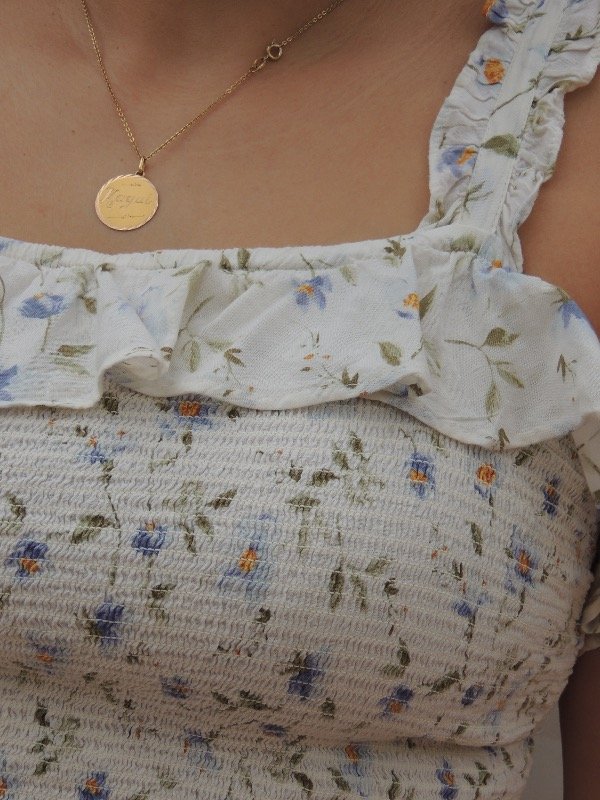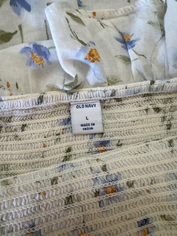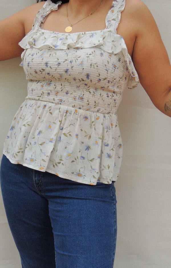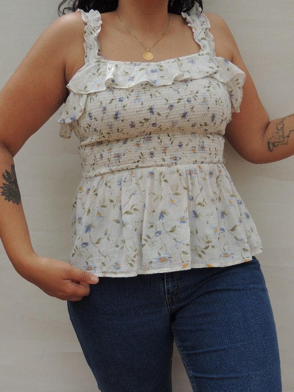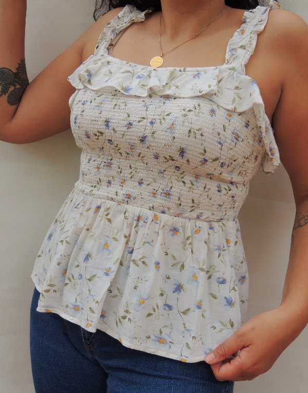 Blusa old navy retro, frente y espalda elastizado con volados en el escote y bajo el busto, voladitos en los breteles.
