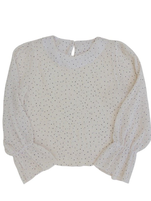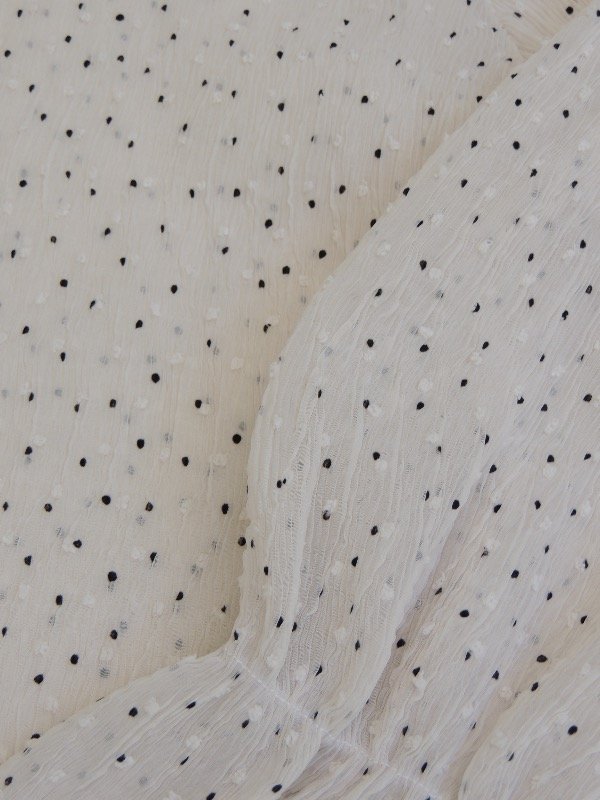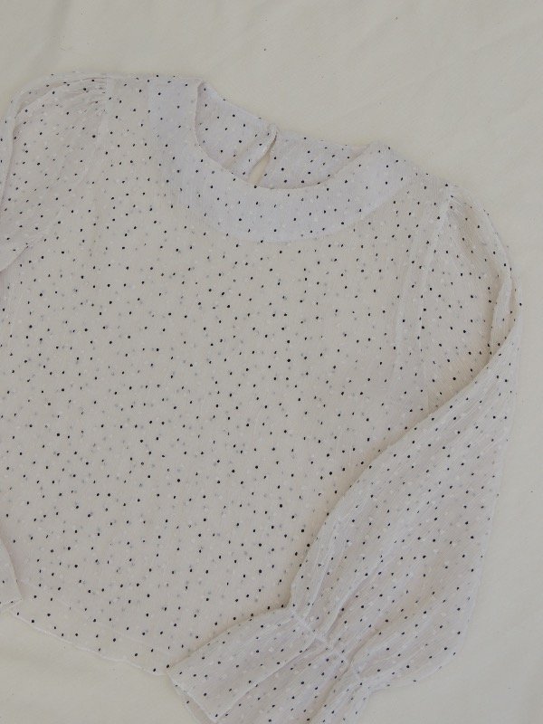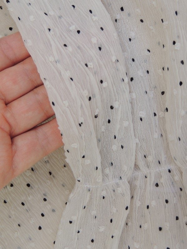 Blusa de gasa plisada con mini lunares y textura rugosa, leve transparencia.