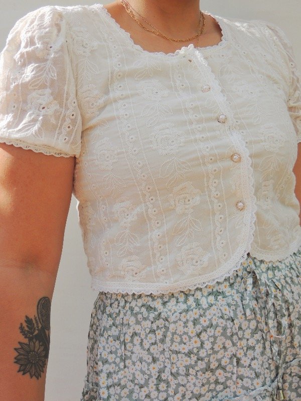 Camisa vintage de Broderie con botoncitos de perla, calada y bordada con forro no transluce ni se ve nada.
