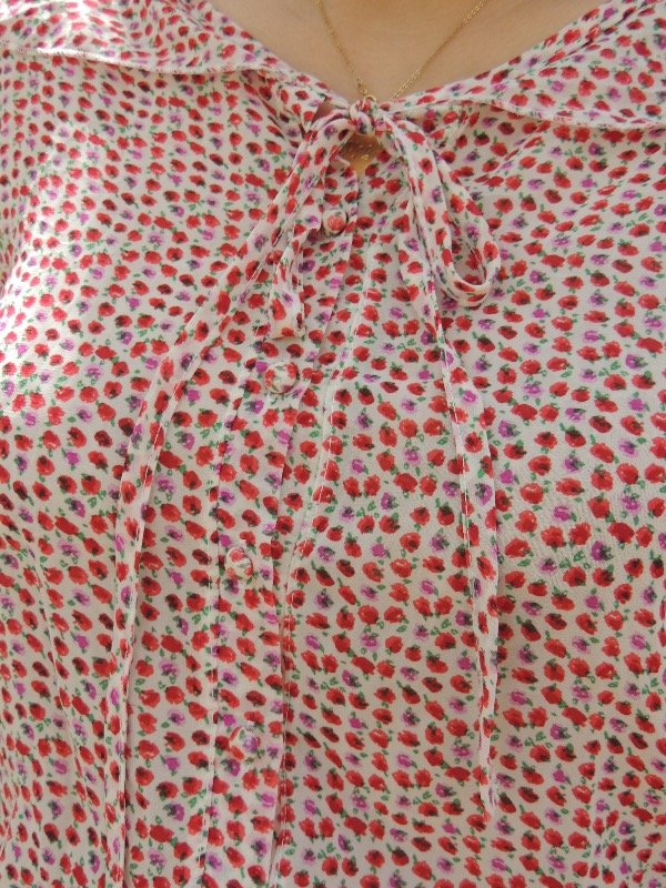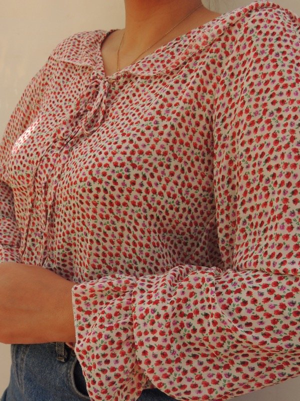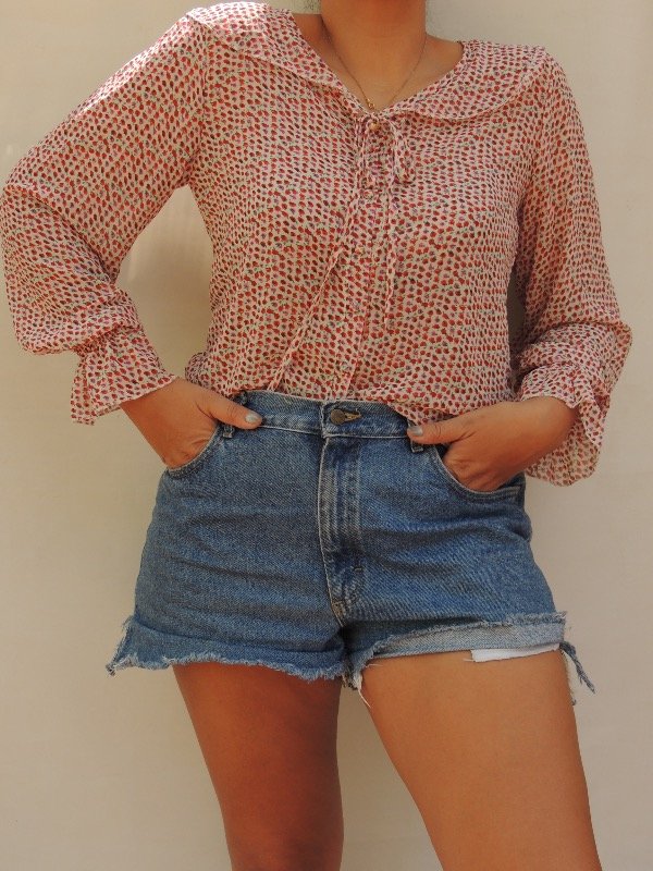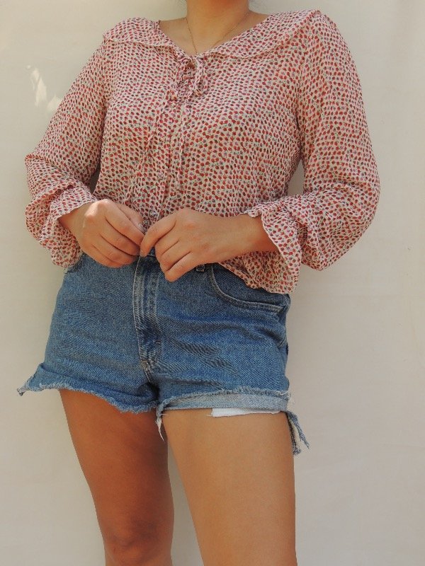 Camisa de gasa super Fresca con cuello com volado, botincitos forradoa y lacito en el cuello.