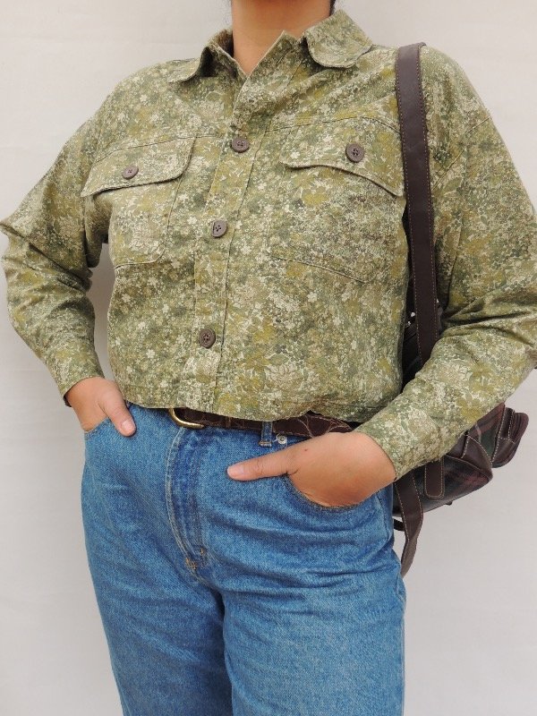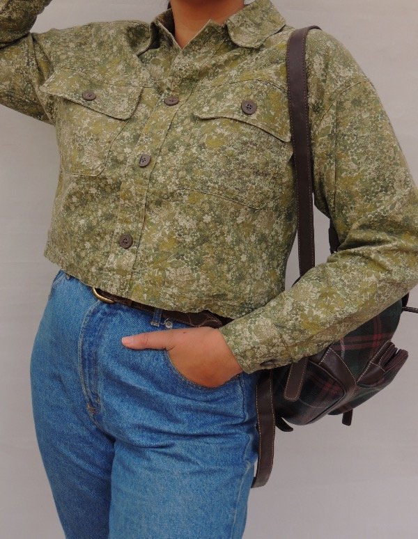 Campera crop retro de gabardina de algodón con bolsillos grandes al frente.