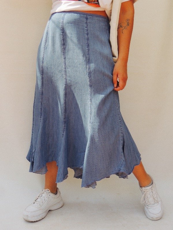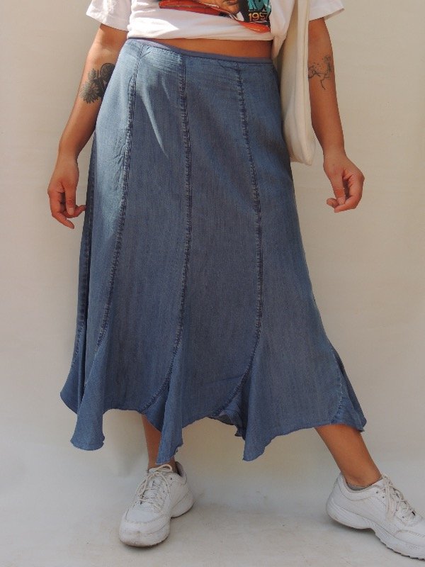 Falda de Jean liviano con corte en gajos que termina en picos al final, cierre lateral.