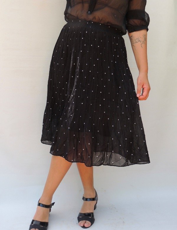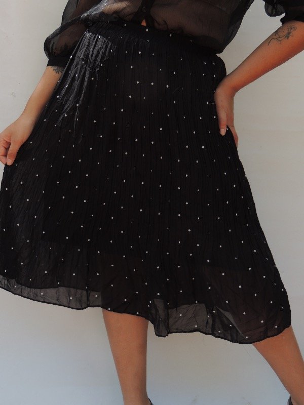 Falda midi tela símil seda con cintura elastizada, plisada.