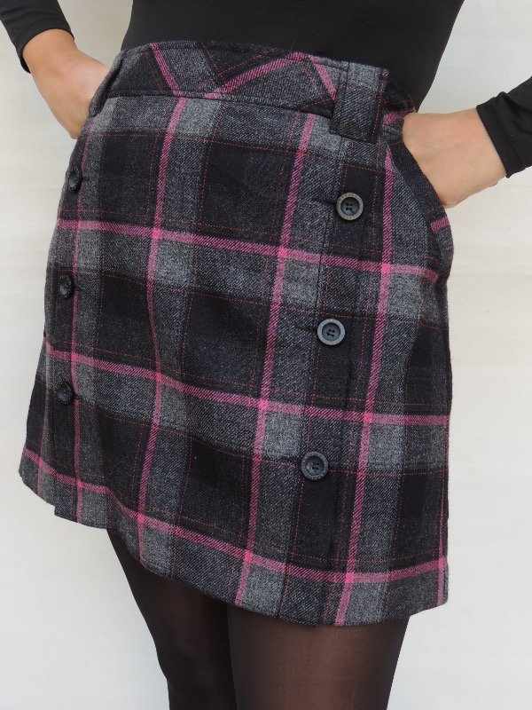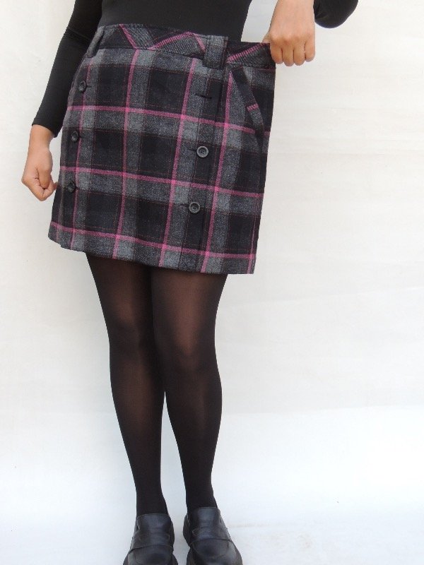 Mini vintage de tela sastrera de lana con botones al frente. Forrada.